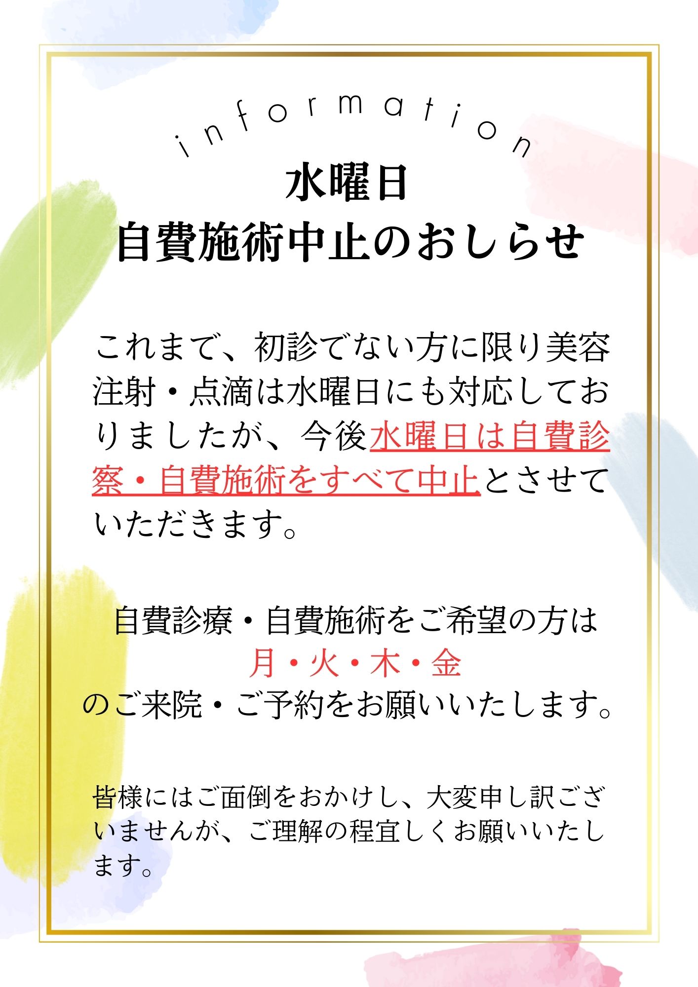これまで、初診でない方に限り美容注射・点滴は水曜日にも対応しておりましたが、今後水曜日は下記の注射・点滴を含む自費診察・自費施術をすべて中止とさせていただきます。