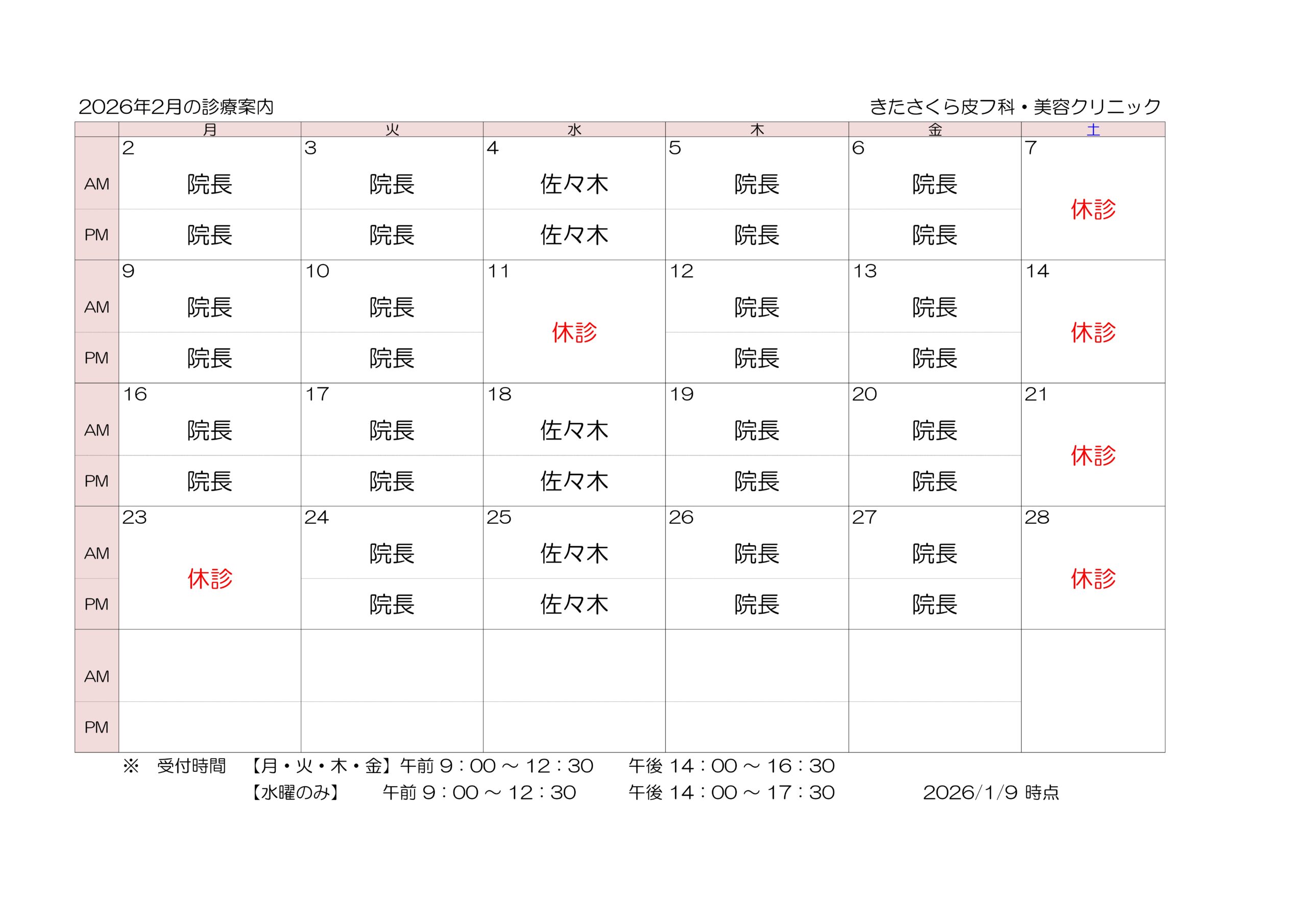 2026年2月の診療担当医は以下の通りとなっております。
